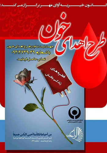طرح " اهدای خون " به همت کانون خیریه آوای مهر دانشگاه علوم بهزیستی و توانبخشی و با همکاری سازمان انتقال خون ایران اجرا می شود.