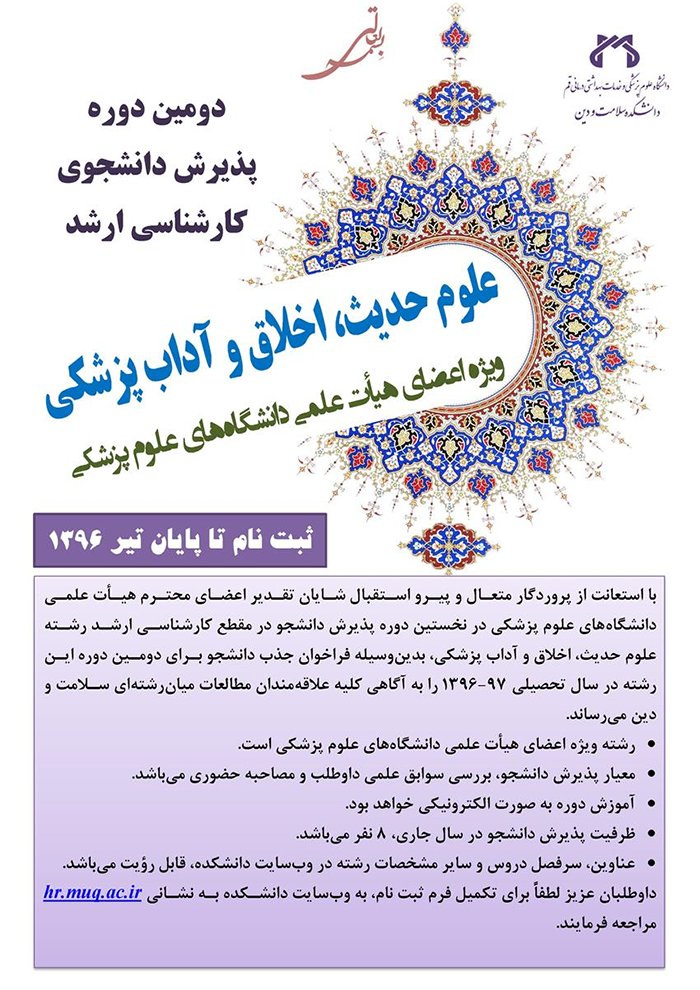 اخبار > دومین دوره پذیرش دانشجوی کارشناسی ارشد علوم حدیث، اخلاق و آداب پزشکی دانشکده سلامت و دین