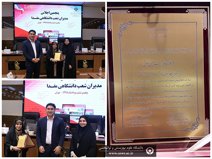 با کسب رتبه چهارم مفدا دانشگاه علوم بهزیستی و توانبخشی در میان ۶۴ شعبه خبری دانشگاه های علوم پزشکی کشور، معاون فرهنگی دانشجویی وزارت بهداشت و مدیرکل روابط عمومی این معاونت، از "زینب طیبی سوق" مدیر مفدا دانشگاه علوم بهزیستی و توانبخشی و دیگر مدیران شعب برتر، با اعطای لوح و اهدای هدیه، تقدیر کردند.
