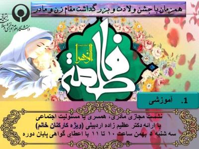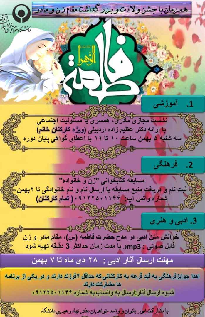 اخبار > مسابقات فرهنگی و هنری بمناسبت سالروز ولادت حضرت زهرا (س) و هفته گرامی داشت مقام زن و روز مادر برگزار می شود
