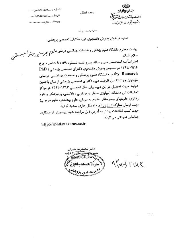 اخبار > تمدید فراخوان پذیرش دانشجوی دوره دکتری تخصصی پژوهشی دانشگاه علوم پزشکی مازندران